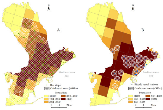 Regarding the proximity to bus stops and bicycle stations, Figure 3 shows the catchment areas of 400 m to bus stops (A), the catchment areas of 300 m to bicycle rental stations (B), and the population density at the most disaggregated level currently available, which is the population in a 1 km square grid [43]. Considering that most people reach public transportation by foot and even transfers between different transports would be almost impossible without walking, the proximity to bus stops and bicycle stations is critical for using these modes.