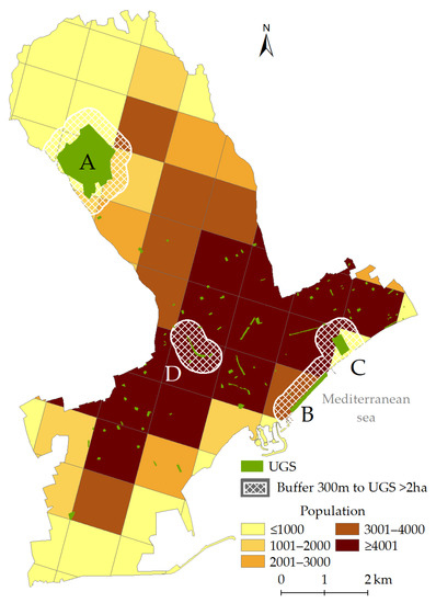 The spatial analysis showed that only around 12% of the area is covered by at least one UGS > 2 ha within 300 m. Further, only 13% of the areas with the highest residential density (>4001 inhabitant/grid) are within 300 m from a UGS > 2 ha. This is explained not only by the reduced number of UGS > 2 ha in the city but also by their peripheral location in relation to the most densely populated areas. In addition, the only UGS with at least 20 ha (the Polemidia National Forest Park) is, on average, three times more distant from the most populated areas than the recommended by the WHO for parks of this size, which is 2 km [63].