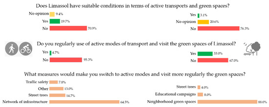 Active transportation and urban green infrastructure are two important components of urban ecosystems and are increasingly recognized as key to any urban planning policy focused on promoting urban sustainability and livability. The empirical study carried out in Limassol showed a poor sustainability performance on these two critical dimensions. The quantitative evaluation of the six selected indicators showed an unsustainable travel pattern and insufficient UGS provision. The qualitative evaluation showed that residents are very unsatisfied with the conditions provided for walking and cycling, as well as with the UGS available in the city. Therefore, the residents’ perception matched the key findings obtained with the quantitative evaluation and provided additional evidence about some interventions that would make Limassol a more sustainable city.