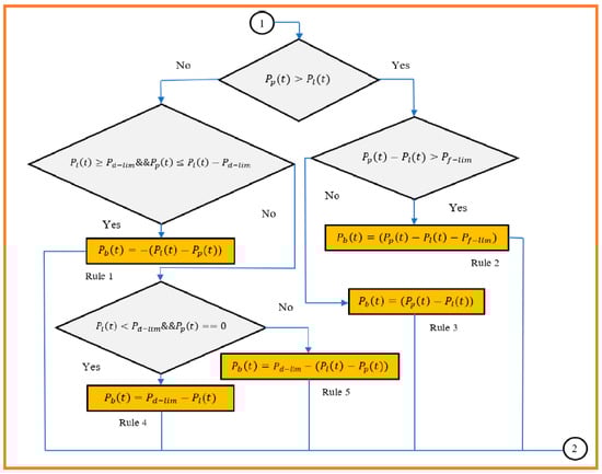 The generation of PV power mostly depends on nature. Therefore, surplus PV energy is stored in BES for future use. If there is a deficit, it will be compensated by the grid. The stored energy of the battery depends on the previous state-of-charge (SOC) at time , generated PV power, and the required loads. Therefore, rule-based EMS is proposed. This rule-based EMS is applied because of its simple logic, user-friendliness, and ease of understanding. The applied rules are explicit for customers and designers. All rules can simply be updated whenever needed. The rules are designed using mathematical modeling for battery charging and discharging. The rule-based EMS is described in this section, which is also shown in Figure 1.