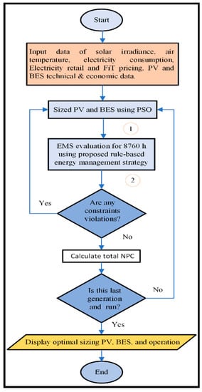 The PSO algorithm is used to solve the optimization problem. The flow chart of the optimization process is shown in Figure 2. PSO was successfully employed to obtain optimal PV-BES component sizing for both residential and commercial buildings [57,58]. The minimization of total NPC is considered an objective function throughout the 20-year period, including capital investment, annual maintenance cost, replacement expense for the BES and inverter after 10 years, interest rate, and electricity escalation rate. The system configuration for optimal operation with EMS is employed. The cases of constraints in PV-BES capabilities, the battery’s SOC, and the PV’s exporting power to the grid are all considered. The maximum PV-BES system capacity is taken into account for reliable load delivery using the grid, PV, and BES. The PV and BES capacities are considered control variables for optimization. The proposed configuration is annually evaluated to determine the lowest total NPC, optimal capacity of the PV-BES system, charging and discharging conditions of the battery, exchanging electricity with the grid, and output power of the PV.