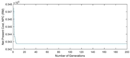 In the creation process of the PSO algorithm, 50 populations with 200 generations have been considered. Furthermore, the system has been optimized over 10 runs to achieve reliable results. The PSO convergence of the proposed configuration is demonstrated in Figure 4.
