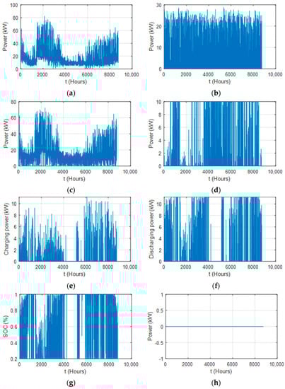 Figure 5g shows the maximum and minimum SOC of the battery varies from 20% to 100%. At various hours of the year, a battery’s SOC is greater than 20%, which means the battery is not completely discharging due to low electricity usage compared to PV generation. Therefore, the battery is charged using PV power supplies after being fed to the load. If load demand is less than the demand limit and PV power is also unavailable, the grid is utilized to charge the battery as illustrated in Figure 5e. It is also taken into consideration that the battery would not produce another peak while using the grid for charging. Battery discharge usually occurs when the load demand exceeds the demand limit threshold, as shown in Figure 5f.