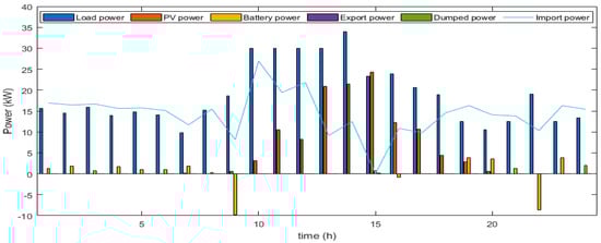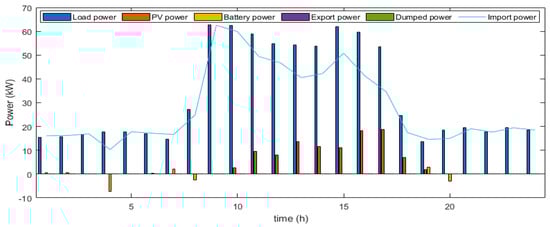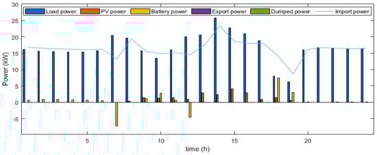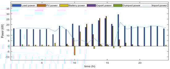 A 24 h energy management strategy of the proposed configuration is shown in Figure 6. When and , the discharging of the battery occurs during = 10, 13, 16, and 17 h; while charging mode = 2, 3, 4, 5, 6, 7, and 24 h, only the grid is utilized as . In contrast, when = 8, 9, 11, 18, 19, and 20 h, after feeding the PV power to the load, if , grid power is used for charging the battery. This is observed only when = 9 h. However, when = 12, 14, and 15 h, PV power is used for charging the battery, as . When = 12, 14, and 15 h, the load demand is satisfied using PV, and the remaining power is used to charge the battery, if there is still any, and then sold to the grid, which is comparable with net zero energy buildings and also introduces the consumer as a prosumer.