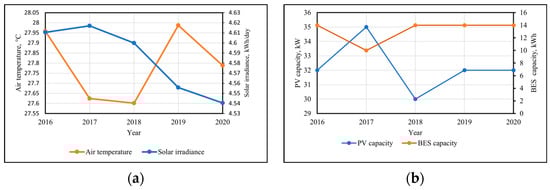 In this article, the FKE-2 commercial building in UTeM is considered a case study. The monthly electric grid bill comprises the C1 tariff as energy consumption at 0.365 RM/kWh and demand charge at 30.30 RM/kW, respectively [59]. Feed-in tariff (FiT) rates are set based on installed PV capacity, as listed in Table 1 [6]. In addition, the Malaysian government provides incentives for the deployment of PV systems in buildings, as listed in Table 2 [6]. The Malaysian ringgit is taken into consideration for cost and pricing. The highest amount of power that can be exported from a building to the grid is 10 kW, along with an average daily energy consumption of 421.55 kWh. A 1 kW installed capacity of a PV system in Melaka, Malaysia, generates an average of 4.9 kWh with an average air temperature and solar irradiance of 26.5 °C and 6.11 kWh/m2/day, respectively [60]. The PV-BES system’s capital cost, maintenance cost, and replacement cost for the BES and inverter after 10 years are all listed in Table 3 [7]. Lithium-ion batteries are considered for integration with PV systems. Actual hourly data for the past year on solar irradiance, air temperature, and electrical loads in the context of Melaka, Malaysia, are used, and this investigation is intended to guarantee the validity of the results. The BES is added in parallel with the PV system in the proposed configuration, as shown in Figure 3.