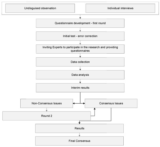 In the research process, a deliberate selection of the sample was selected. The purposeful selection provided initial data, which were then analyzed. Experts were invited to participate in the research, including the management of urban transport systems, and implemented the effects of activities on efficiency, safety and traffic management. The Delphi study was used to collect the data. This method was developed in the 1950s by Norman Dalkey and Olaf Helmer. It was developed to obtain expert consensus [44]. The Delphi study is carried out in rounds; the number of these rounds depends on whether the outliers are adjusted and the achievement of a common position in the questioned areas [45]. The research process is considered complete when (a) there is a strong consensus, (b) there is no progress compared to the previous round and no consensus has been reached. The group of experts in research using the Delphi study does not rely on statistical power but is selected depending on the needs of the research [46]. In the literature, the selection of the number of experts is varied; a sample of 10 to 18 experts [46] or even from 5 to 60 experts is indicated [47].