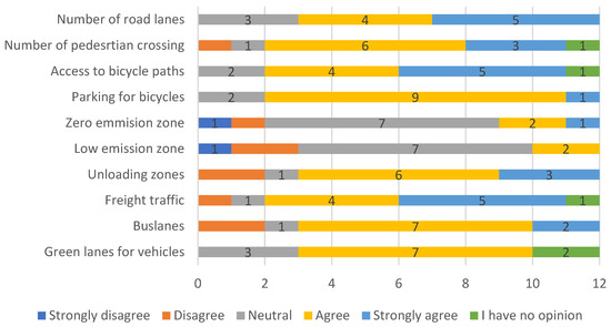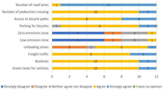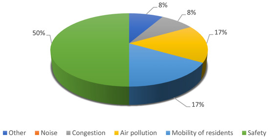 Analysis of the data presented in the graph showed that the activities of local government units should mainly be aimed at ensuring the safety of their citizens. Half of the experts participating in the survey indicated this factor as a priority. Other aspects that city authorities should take into account in their policy are the mobility of residents and the problem of air pollution. One person was in favor of implementing measures to reduce transport congestion, as was the case with another’s response to which the factor “fun and live” was assigned. Cities focused on promoting more friendly forms of movement and encouraging residents to walk, cycle or use public transport include in their strategies the reduction in road accidents involving VRUs and the increase in their safety in road traffic and increase in their mobility [48,49]. None of the experts answered noise, although it is proved in the literature that this factor negatively affects the quality and health of society. The increase in the number of residents, which is characteristic of urban areas, corresponds to the increase in the number of vehicles in cities. As a consequence, the increase in road traffic contributes to the increase and emission of traffic noise [50]. In addition, traffic noise is the main source of noise pollution in cities [51]. The question was a one-choice question; therefore, it can be assumed that the noise was not completely ignored but found its place in other problems indicated by the experts.