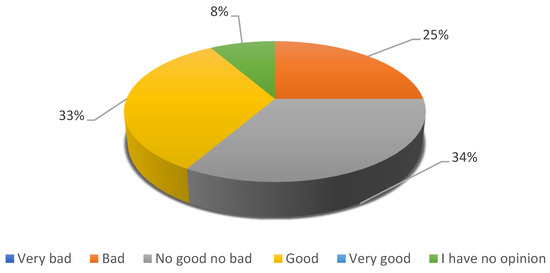 Seven experts responded that technological solutions are systematically implemented in the area of transport. These were respondents from Barcelona, Oslo, Szczecin, Nowy Targ and one expert from Czestochowa. On the other hand, five experts replied that such solutions were not implemented in their cities. These cities include Amsterdam, Naples, Rabka Zdroj and Czestochowa. Technological solutions in the area of transport are implemented as a result of identified needs of the city and transport problems [52]. Solutions of this type affect the management of the urban transport system, the organization of transport, vehicle traffic and society, as well as reduce the negative impact on the environment. The next question also concerns the city represented by experts. They were asked to evaluate the development of the city’s transport infrastructure over the past five years. The answers are presented in Figure 4.