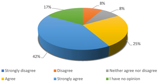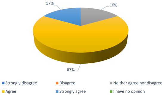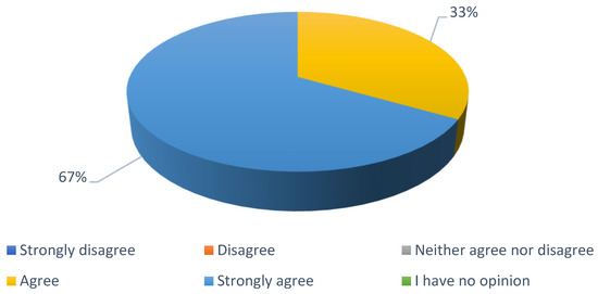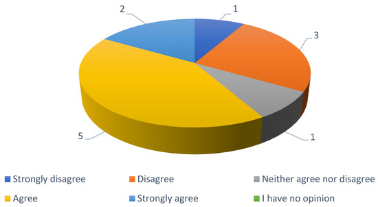 In the next question, experts were asked if they agreed with the statement that European cities support pedestrian safety more than other road users. The answers to this question from the first round are presented in Figure 11. In the first round, the experts’ opinions were divided. Four experts disagreed with the statement presented in the question by ticking the answers “I strongly disagree” and “disagree”. Seven experts agreed with the statement and one said that European cities can focus more on pedestrian safety than on other road users. This question was asked in the second round due to the need to receive a consensus on this matter.