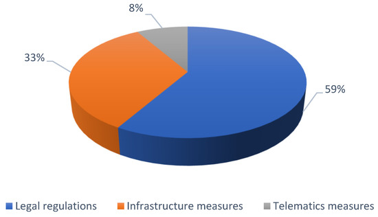 Each of the indicated solutions that can be implemented by the authorities is used to reduce road accidents involving vulnerable road users. Nevertheless, based on the collected data, it appears that the most frequently chosen solutions by the authorities are those concerning legal regulations. Legal instruments cover many areas, including traffic management system, road infrastructure, road signs and signals, admission to motor vehicles, road rules, driving time and rest time for professional drivers, and others [53]. Other solutions important from the point of view of building a safe transport system are transport infrastructure solutions. Interestingly, according to the previously presented data, road infrastructure is the basis for implementing technological solutions in the area of transport. This question was repeated in the second round to reach a consensus. The experts’ answers were as follows: 10 of them answered that solutions in the field of legal regulations are most often implemented, 1 expert pointed to solutions in the field of transport infrastructure and 1 expert to telematics solutions. The research results allowed for systematizing the importance of solutions in creating a safer environment for vulnerable road users. For this reason, the main role of implementing and refining organizational and institutional solutions is indicated.