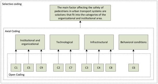 The collected data were divided into four categories of solutions, which allowed the identification of the most important areas affecting the safety of pedestrians in the urban transport system. As part of selective coding, in which inductive analysis was used, which allowed for concluding that the main factors affecting pedestrian safety are institutional and organizational solutions, followed by infrastructural solutions.