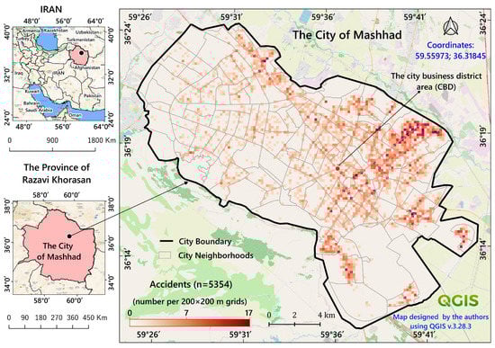 The city of Mashhad, with a population of 3,373,000, is the capital of Khorasan-Razavi Province and the second-most populous city in north-eastern Iran (36°37′–36°58′ N, 59°26′–59°44′ E), covering a total land area of 307 km2. It is divided into 175 neighbourhoods (Figure 1), and the average population density is 13,287 people per km2, with the highest density in the city’s eastern regions at 42,518 people per km2. The total length of the city road network is 6831.5 km, which covers 70 km2 (22.75%) of the city area. The average speed of vehicles is 63 km per hour (kph) [59]. Due to this city’s religious and tourist role, more than 1,200,000 vehicles are in constant movement daily [60]. In this study, the neighbourhood level was used as the spatial unit for data extraction. We used ArcGIS, v. 10.8 (ESRI, Redlands, CA, USA) [61] for prediction and analysis and the QGIS [62] platform for thematic mapping, dividing the study area into a grid with 200 × 200 m cells, with the PTAs aggregated per cell (8424 cells in total) based on the ArcGIS tessellation tool [63]. The study covered the years from 2018 to 2022.