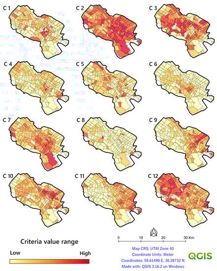 In this equation, C1–C12 are the criteria maps (Figure 2) based on the criteria (Table 1), and the numbers are the weights calculated by the AHP method.