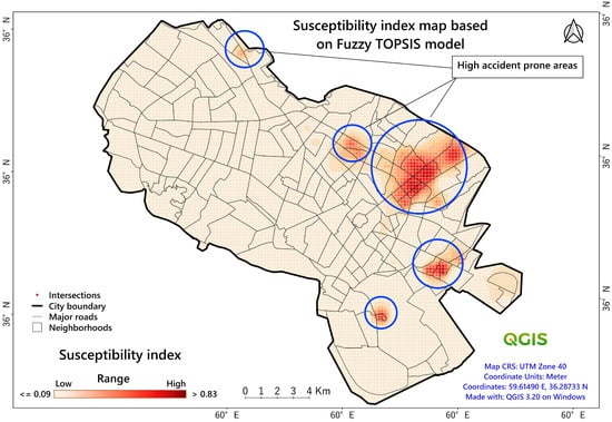 Susceptibility index map of accidents based on fuzzy-OPSIS analysis.