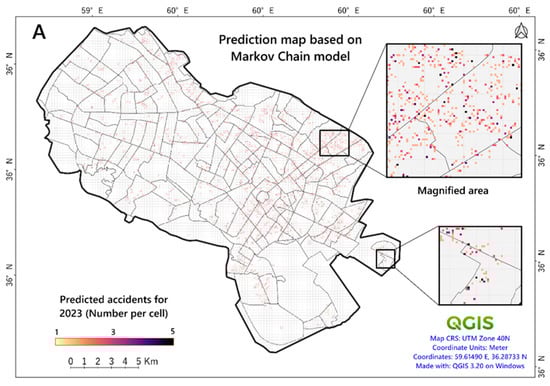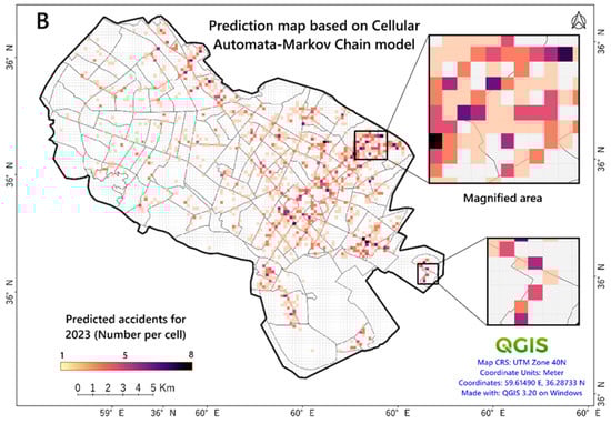 Figure 6A shows the spatial distribution map of predicted accidents for 2020 based on the MC model. According to these maps, each cell represents the predicted number of accidents in each defined class, but the output image cells are distorted, so valuable information cannot be extracted and interpreted from the MC output map. However, according to previous studies [92,93,97], this model’s output can be combined with the CA model discussed in the following section.