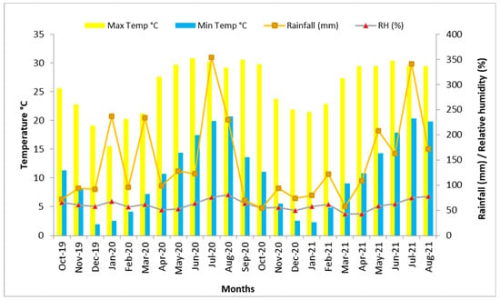 Mean monthly temperature (°C), rainfall (mm) and relative humidity (%) during cropping season (Source: Meteorological Observatory, Department of Environment Science, Dr Y S Parmar University of Horticulture and Forestry, Nauni, Solan, HP 173230).