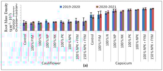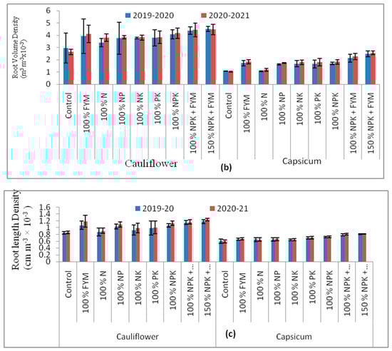 Different treatments significantly influenced the root-length density of cauliflower and capsicum during both the years of study (Figure 2c). The root-length density of both the crops under balanced and imbalanced fertilization was markedly improved over T1 (absolute control). Pooled data analysis showed that the highest RLD was recorded in treatment T9, i.e., 150% NPK + FYM (1.21 cm m−3 × 10−4 in cauliflower and 0.81 cm m−3 × 10−3 in capsicum), while the lowest was under the control (0.85 and 0.60 cm m−3 × 10−4) for cauliflower and capsicum respectively. All the treatments significantly increased the root length density over the control. After two years of fertilization, balanced fertilization increased the RLD by 42.0% and 35% in cauliflower and capsicum respectively, over the control (absolute). In general, the replacement of inorganic fertilization along with the integration of inorganic and organic fertilization could effectively improve the growth of absorbing roots which proliferate more under porous soils with the addition of organic manure. As the addition of organic manure improves, the physical properties of soil, i.e., water holding capacity, soil aggregation, porosity, etc., which are responsible for the growth of absorbing roots; otherwise poor physical status of soil promoted the growth of conducting roots, which became more under deep soil (nonporous).