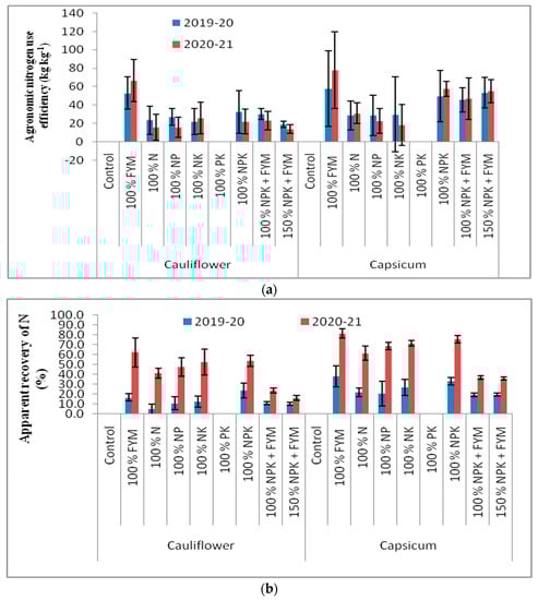 Effect of nutrient management on (a) agronomic nitrogen-use efficiency (b) apparent recovery of nitrogen of cauliflower and capsicum. The error bar indicates the SEd ± of the treatments.