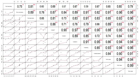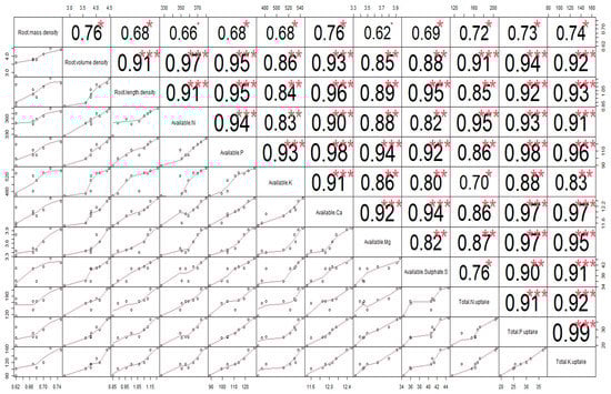 Correlation of root-mass density (RMD), root-volume density (RVD), root-length density (RLD), available N, available P, available K, available Ca, available Mg, available sulphate-S, total N uptake, total P uptake, and total K uptake in capsicum. *, **, and *** represent significant levels of correlation coefficients of p < 0.05, p < 0.01, and p < 0.001, respectively.