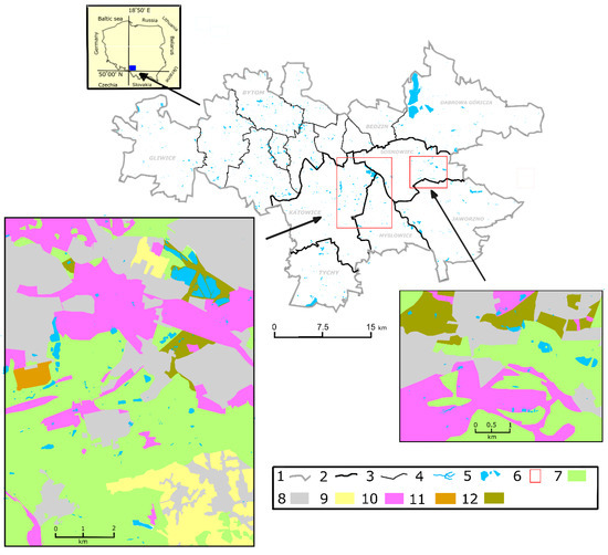 - Studium Uwarunkowań i Kierunków Zagospodarowania Przestrzennego Miasta Katowice [Katowice—Master Plan—Study of the Conditions and Directions for Spatial Development]; Municipal Office in Katowice: Katowice, Poland, 2012.