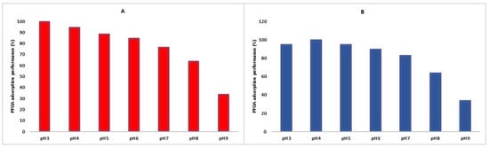 3.3. Assessment of the Initial pH of the Solution and PFOA Adsorption Mechanism