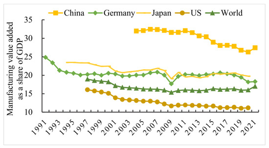 From a global perspective, global manufacturing value-added distribution is more concentrated, and the development gravitational center is primarily concentrated in a few countries, such as Europe, the United States, Japan, and China. From 2004 to 2021, even after the global financial crisis, the global manufacturing value added has been overgrowing since 2000. Following a temporary decrease in 2009, the global manufacturing value experienced a resurgence and began to rise again in 2010, as indicated in Figure 1. Even some deindustrialized countries, such as Germany and France, realized the negative impact of deindustrialization after the global financial crisis and started to pay attention to the development of the manufacturing industry, increasing manufacturing value added.
