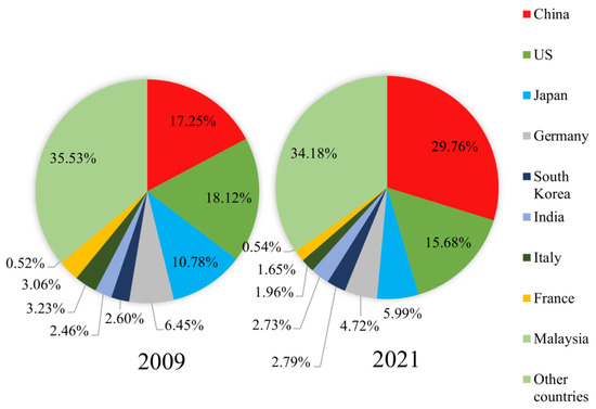 China’s manufacturing value added accounts for 27.7% of its GDP in 2022 [25] and 29.76% of global manufacturing in 2021. As depicted in Figure 3, the global share of China’s manufacturing value increased dramatically from 2009 to 2021, with China’s manufacturing value added accounting for nearly 30% of global GDP in 2021 and ranking first, followed by the United States, Japan, and Germany. China’s manufacturing value added reached 27.4% of GDP in 2021, an increase of 1.1 percentage points from the previous year, achieving positive growth for the first time in a long time. This is partly attributed to China’s manufacturing sector experiencing rapid growth, with a significant increase in China’s exports as a proportion of global exports. Additionally, the containment of the epidemic and the rise of advanced manufacturing, which encompasses high-tech industries such as information technology and upgraded traditional manufacturing industries through advanced technology and management practices, have also played a role.