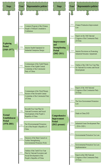 The development process of China’s manufacturing policy is a process of deepening and improving the concept of green development in practice. In order to fully present the evolution of the manufacturing policies for green development in China, this research divided the policy into four phases: the exploring period (1949–1977), the formal establishment period (1978–2001), the improvement and strengthening period (2002–2011), and the comprehensive improvement period (2012 to present), as shown in Figure 7.