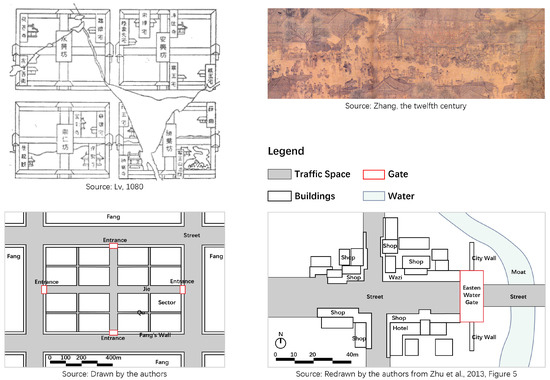 China’s general urban structure before the Song Dynasty was called Li-Fang system, which consisted of enclosed and distinct urban wards or ‘Fangs’, rectangular in shape and encircled by walls. All functional areas, such as the neighborhoods and marketplaces, were, respectively, settled within the Fangs. No gates except main entrances of Fangs and of aristocrats’ houses and Buddhist monasteries could be set on such walls. Inside the Fangs, the first-grade internal crisscross roads called ‘Jie’, which opened onto the Fang’s four main entrances, and the second-grade roads called ‘Qu’ further divided a Fang’s interior space into multiple sectors. Along these roads, the gates of the ordinary residences or shops could be set up. People passed in and out the Fang through the four Fang’s entrances or gates, which were opened and closed at a fixed time every day. In this way, the spatiotemporal design of the Fang facilitated the imposition of a dusk-to-dawn curfew to its residents or merchants and of the emperor’s control on them (Figure 2).