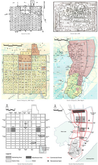 Additionally, many relevant studies on Hangzhou’s urban pattern and structure evolution are qualitative research with no or only raw historic maps and lack a spatial perspective [23,37,56]. By contrast, we introduce and merge the data and information of classic ancient texts and historic maps to display the dynamic transformation of Hangzhou, through graphic analysis of the structuring of the same urban commercial elements, such as the streets, districts, and complexes, generating, inheriting, revitalizing, and reutilizing urban heritages. Through tracing the sequential changes in the same spatial elements on maps, we believe that Hangzhou’s shaping and restructuring process is more clearly displayed than through pure text or individual graphics (Figure 8).