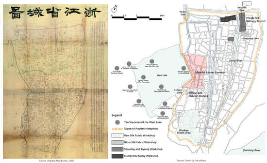 The late-Qing Hangzhou’s map (left) and its silk industry districts and scenic spots (right) [50]. Note: The non-English terms in the historic map on the left are the names of the map, streets, rivers, lakes, and houses.