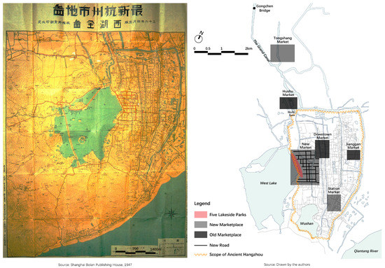 The early twentieth century Hangzhou’s map (left) and its old and new marketplaces (right) [50]. Note: The non-English terms in the historic map on the left are the names of the map.