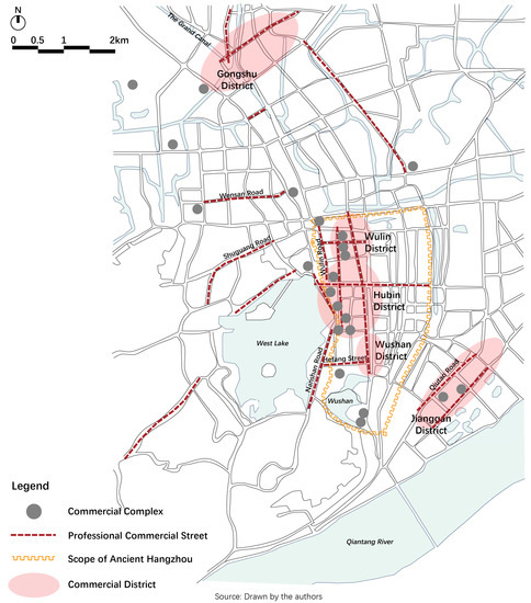 One new element was professional commercial streets, which severed diverse trade and retail and became new highlights of Hangzhou’s modern commerce. From the 1990s, eighteen special commercial streets, including silk streets, clothing streets, tea culture villages, and so on, were established. Some streets were well known for selling special products, such as Wulin Road featuring women’s dress, Wensan Road featuring digital products, and Qiutao Road featuring home furnishing. Some provided catering, recreation, and refreshment, such as Shuguang Road and Nanshan Road. Tourists could enjoy themselves in some specialty bars and restaurants on these streets. Some others, like Hefang Street near Wushan Scenic Area, were characterized by their culture and profound history, which show the local attraction and national and historical characteristics. The other kind of new element was the mushroomed commercial complexes ever since the 2010s, which contained all kinds of shopping and recreational facilitates. These commercial complexes, as spread across the urban area, attracted many people, and they function as the Song Wazis of the present day. However, they differed from the Wazis in their more even spatial distribution and accessibility (Figure 6).