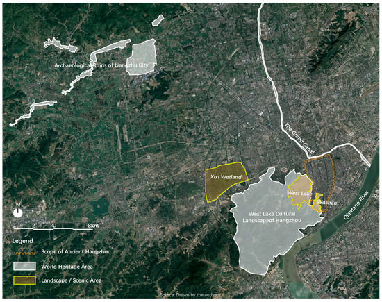 To answer the first question, we assume, through studying the ancient texts, historical maps, and related literature, that the first and foremost driver of Hangzhou’s sustainable development and urban structure transformation is commercial culture, rather than other factors. Commercial development force and correlated commercial culture once made Hangzhou the primary prosperity metropolis of some ancient empires and are still shaping contemporary Hangzhou. This force also generates and reuses the city’s abundant legacies and heritages. As a result, Hangzhou presently occupies three World Heritages, namely the Archaeological Ruins of Liangzhu City, the West Lake, and the Grand Canal of Hangzhou section, which were, respectively, formed in different historical periods and have been sustainably retained. While the active roles of the West Lake and the Grand Canal of Hangzhou Section in shaping the city are widely recognized and studied, that of the Archaeological Ruins of Liangzhu City, Hangzhou’s newly added World Heritage, in reframing the spatial structure of Hangzhou remains to be studied. Most current studies on Liangzhu are concentrated on its own rise and fall [34], its interaction between the environment and climate change [35], and its Neolithic culture [36], among others.