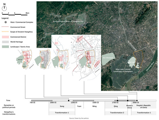 Hangzhou, an ancient Chinese city with more than 2000 years’ history, initially became known to the Western world in the thirteenth century due to the record of the Venetian traveler Marco Polo [1]. However, as one destination on the Silk Road, Arabic merchants and travelers had already visited the city even earlier [2], during Hangzhou’s highlight moment, when it was the dynastic capital of an oriental empire, the Southern Song Dynasty (1127 CE–1279 CE). Japanese scholars took the lead in studying China’s Tang (618–907 CE) and Song (960–1279 CE) cities, as they wrote the first urban history studies of these cities in the 1930s and 1940s, which triggered the interest of urban historians from other countries and internationally,; an interest that has persisted to this day [3].
