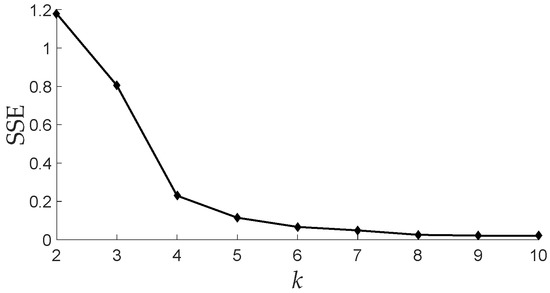 Calculate the SLI according to Equation (21) to obtain the 24 h SLI curve (see Figure 3), and then seek the optimal k value of the SLI curve by using the elbow rule, and the SSE curve is shown in Figure 4.