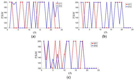 where and indicate the downward and upward climbing rate of GT, respectively (); represents the output of GT in (t − 1) period (kW).