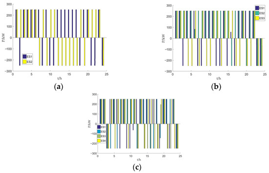 Scene 3: The total voltage deviation, the total power loss and the total operating cost are reduced by 20.12%, 23.24% and 12.39%, respectively, compared with those before optimization. The output of the two GTs reached the limit throughout the whole day. Compared with the other two scenes, the total operating cost in this scene is the highest, and is the highest, because the ES has the most access and the most output. In addition, is the lowest, because the source–load imbalance in this scene has been greatly improved, and the GT has less output, so is also the lowest. The total voltage deviation and total power loss are the lowest, because the number of ES accesses is large, and the ability to adjust the voltage and network loss is strong.