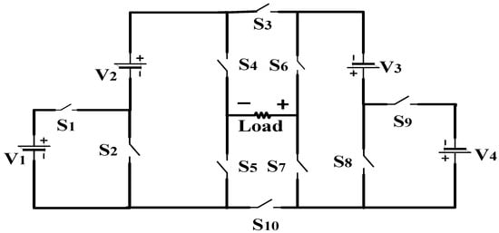 Figure 1 shows the new topology of symmetric nine-level MLI. For simplification, the PV stages are replaced with DC sources. It consists of 10 switches and 4 DC sources. Symmetric MLI consists of an equal magnitude of voltage sources. The magnitude of the four voltage sources is selected in the ratio of 1:1:1:1 with voltage magnitude of 24 V.