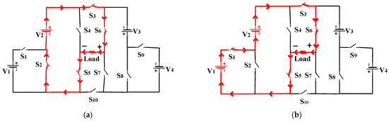 The switching states of the proposed nine-level MLI are presented in Table 1. This topology generates nine voltage levels which consist of 0, ±1, ±2, ±3, ±4. This switching scheme generates four positive voltage steps from +V to +4V, zero output voltage steps, and four negative voltage steps from −V to −4V.