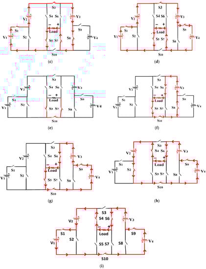 Figure 2 shows the operating modes of the new topology of MLI. To produce + mode 1 activates switches are shown in Figure 2a. Mode 2 activates switches to produce +2 are shown in Figure 2b. Figure 2c shows that mode three is activated to produce by turning on . Mode 4 activates switches to generate are shown in Figure 2d. Mode 5 is activated by turning on switches but cannot generate output voltage as shown in Figure 2e. In this manner, modes 6, 7, 8, and 9 generate negative polarity outputs according to the same operation phase as Modes 1 to 5, shown in Figure 2f–i.
