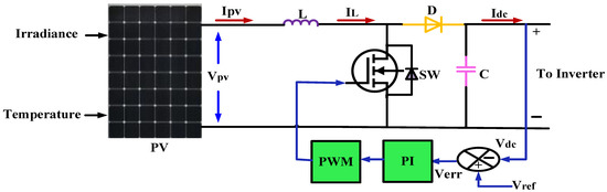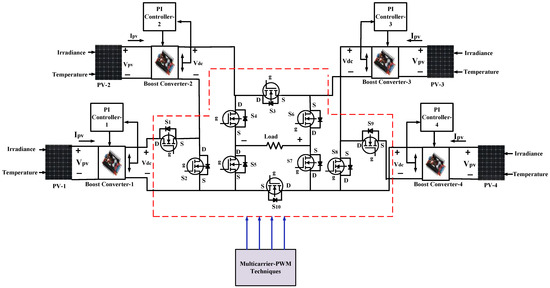 The PV Panel is coupled with a DC/DC converter with PI controllers to enhance the performance of the PV system and obtain consistent output voltage at varying irradiance. Implementing PI controllers is the main advantage of irradiance change in the DC-DC converter. Therefore, this work uses a DC-DC boost converter with a PI controller to provide the optimum voltage for the proposed [31]. Figure 3 shows the complete proposed system for the new topology of a nine-level inverter with ten switches and four PV panels. Figure 4 shows the PV system, which includes a PV system and a boost converter with PI controllers.