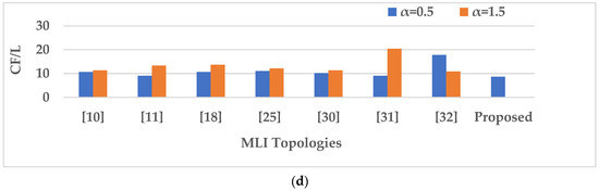 Another important parameter of MLI is the cost function (CF). The CF is crucial for selecting the MLI that is most appropriate for the application.CF can be calculated by considering the switches count , DC sources count , capacitors , , diodes count , and gate drivers count [29]. The cost function is given in Equation (9):