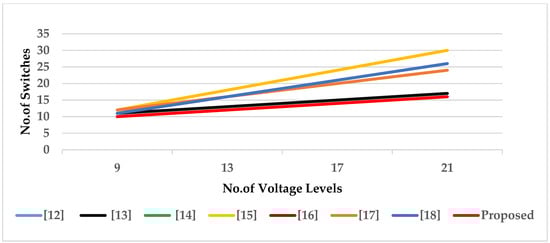 The graphical representation of respective comparisons is shown in Figure 6. Figure 6a compares the total standing voltage per unit ( of the proposed topology compared with other existing topologies. Figure 6b compares the number of gate driver circuits ( of the proposed topology with other existing topologies. Figure 6c shows the number of component counts per level (CC/L) in the proposed topology with other existing topologies. Figure 6d compares the cost function per level (CF/L) at 0.5 and 1.5 values of the cost coefficient of the proposed topology with other existing topologies. The comparison graph between no. of switches concerning voltage levels is shown in Figure 7. It shows that the proposed topology requires fewer switches with an increase in voltage levels compared to existing topologies of MLIs.