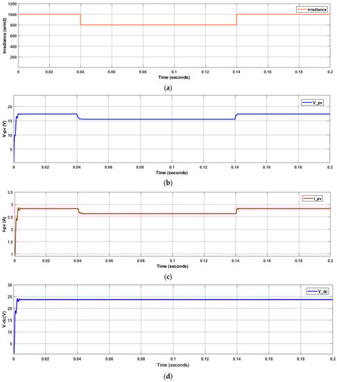 (a) PV irradiance (b) PV voltage at variable irradiance (c) PV current at variable irradiance (d) DC voltage at variable irradiance (e) DC current at variable irradiance.