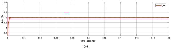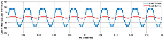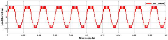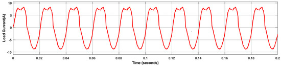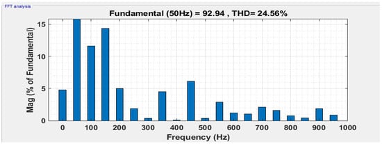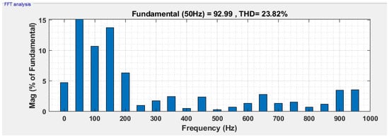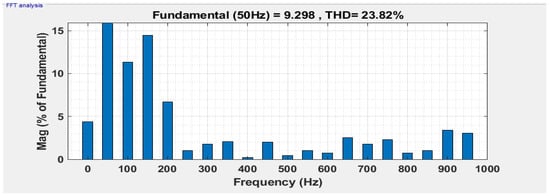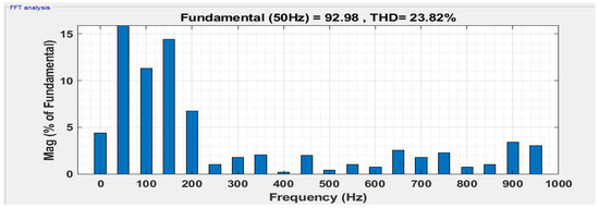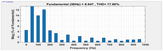 In the first case, the resistive load is 12 Ω, and the PV irradiance varies from 1000 to 800 from 0.04 s to 0.14 s as shown in Figure 8a. The variation in PV voltage concerning irradiance is shown in Figure 8b. Figure 8c shows the variation in PV current. Since PI controllers are implemented with four PV arrays with boost converters to maintain the outputs of the proposed topology at variable irradiance. The constant DC voltage is shown in Figure 8d. Each produces a DC constant voltage of 24 V. The constant DC current is shown in Figure 8e. Figure 9 shows the load voltage and load current of the proposed topology nine-level MLI. Figure 10 shows the load current of the proposed topology. Fast Fourier Transform (FFT) spectrum of the load voltage and load current with PD-PWM are shown in Figure 11 and Figure 12.