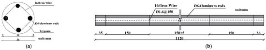 In order to conveniently measure the internal forces of the micropiles, four Φ6 aluminum rods and #16 iron wires (Φ1.6) were selected for the longitudinal and hoop reinforcement of the micropiles, respectively. As depicted in Figure 3, the reinforcement area measured 1.1304 × 10−4 m2. Gypsum was mixed with a water-to-plaster ratio of 1:0.7, resulting in an elastic modulus of approximately 4.5 × 109 Pa. The composite elastic modulus of the pile body was currently around 1.167 × 1010 Pa, which satisfied the similarity requirements with a ratio of about 2.95.