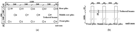 Circular PVC pipes with a diameter of 40 mm and a wall thickness of 2 mm were used as molds for the micropiles. After the “steel cage” (aluminum rods) was placed, the grouting (gypsum slurry) was poured and cured to form the piles. To ensure sensor reliability, they were pre-buried in the micropiles. The schematic of the connection beam structure is shown in Figure 4.