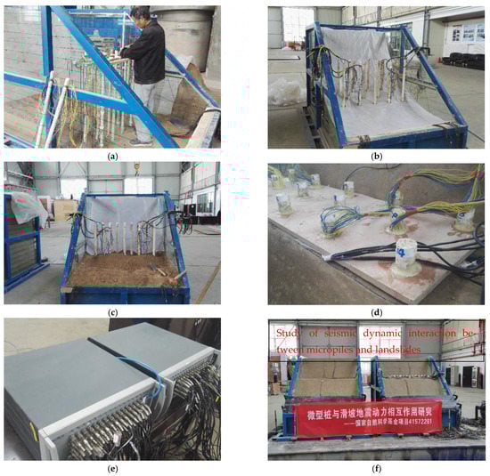 The landslide model was constructed within a conventional rigid model box, with internal dimensions measuring 2.4 m in length, 1.4 m in width, and 1.6 m in height. Prior to the model construction, a layer of gravel was laid on the inside bottom of the box to reduce the relative movement between the box and the soil. The landslide model was built in a standard rigid box with internal dimensions of 2.4 m (L) × 1.4 m (W) × 1.6 m (H). The design of the micropile model follows the similarity relationship of the landslide model, and takes into account factors such as micropile fabrication, sensor arrangement, and difficulty of model installation. In the process of building the model, in order to ensure the consistency of the compactness of the accumulation during the test, the model filling followed the principle of “layered filling, layer by layer compaction”. The entire stacked body was compacted in two layers to ensure that the thickness of each layer did not exceed 200 mm. In the stacking process, the hammer was used to start from the four sides, and then continued to the middle construction; and finally the entire layer was evenly knocked the same number of times. When the slide part of the landslide model was filled, after filling to a certain height, the prefabricated and cured micropiles were installed. After the micropiles were installed and fixed, we continued to fill the sliding machine according to the position of the sliding surface designed by the model, and after the completion of the sliding machine filling, the sliding surface was leveled and a double-layer plastic film was laid. At this time, the model slide was filled. The model was filled to the design position and the corresponding sensor was placed. After the filling was completed, the model box was hoisted to the shaker table. Then, the slope was trimmed according to the model design, and the fixed connecting beam was installed with epoxy resin (as shown in Figure 4), and the model production work was completed. The specific construction process of the model in this experiment was as follows: fixing the micropile at the designated position → compacting the sliding bed → cutting the sliding surface shape → laying a plastic film → making the sliding body → cutting the slope surface → fixing the pile top plate. The constructed landslide model is shown in Figure 5.