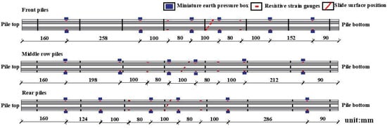 The static test mainly included the force of the micropile, the deformation of the landslides, and the soil pressure distribution. The deformation of the landslide body is mainly measured by displacement gauges, and KTR2-100 resistance displacement gauges were used for the displacement measurement in the static test. The interior of the box was lined with 10 cm thick polystyrene foam board at both ends, effectively mitigating the reflection of incident waves from its boundaries. As depicted in Figure 6, two displacement gauges were positioned at the shear outlet of the landslide body and on the middle platform and top of piles #2 and #4, respectively, to monitor incremental deformation. To fully comprehend the soil pressure distribution within the landslide body, it was crucial to track the micropile internal force distribution.